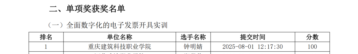 个人赛场上,钟明婧教师表现突出:她不仅斩获个人总分三等奖;更在专项技能比拼中展现过硬实力,分别在“全面数字化的电子发票开具实训”与“财产和行为税合并申报实训”两个单项中位列全国前10名,成功拿下两项个人单项奖,成为本次赛事的“多奖得主”。