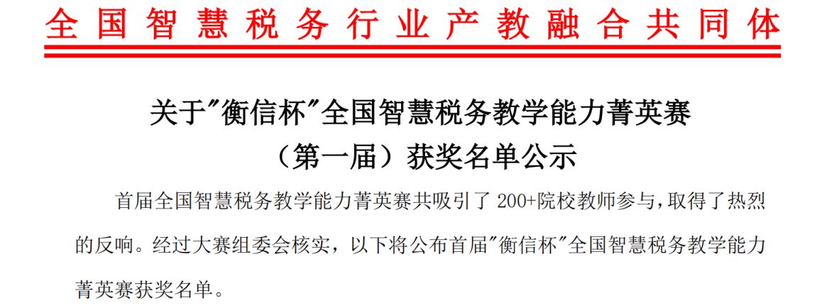近日,由全国智慧税务行业产教融合共同体主办的首届“衡信杯”全国智慧税务教学能力菁英赛落下帷幕,竞赛结果正式公示。yl7703永利官网凭借扎实的教学功底与高效的团队协作,在全国 200 余所院校的激烈角逐中脱颖而出,不仅荣获团体总分一等奖,教师个人赛亦收获多项荣誉,充分彰显学校在智慧税务教学领域的实践实力与育人成效。