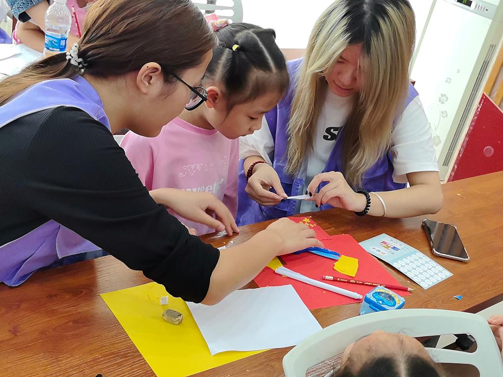 活动当天,志愿者们整装待发早早前往社区,到达社区后,在活动负责人的简短叮嘱后,活动现场,志愿者们提前准备好红色和黄色卡纸、剪刀、胶水等材料。