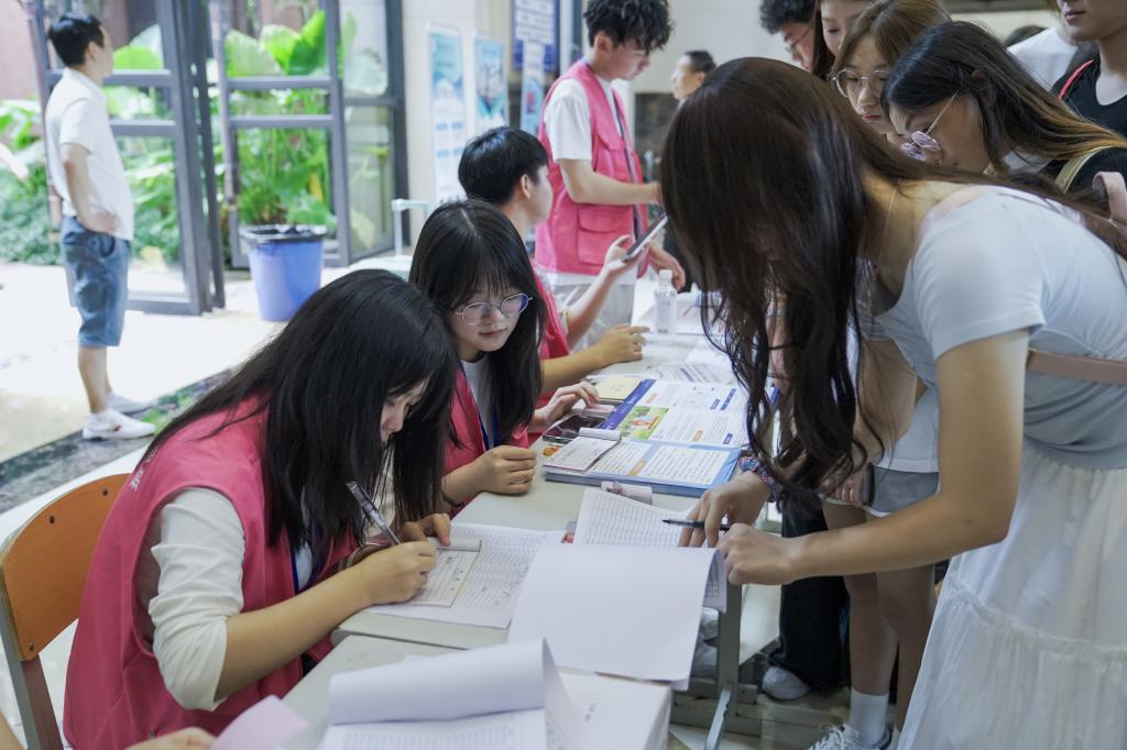 志愿者们早早便分散在校园各处“蹲守”。在学校大门口,他们看到拖着行李箱的新生,便立刻迎上去,一边接过行李,一边热情地打招呼:“同学,欢迎来到数字工程学院!”随后,便陪着新生向报到点走去。走到教学楼下,他们会介绍说:“这几栋楼里有很多专业教室,以后上课经常会来。”